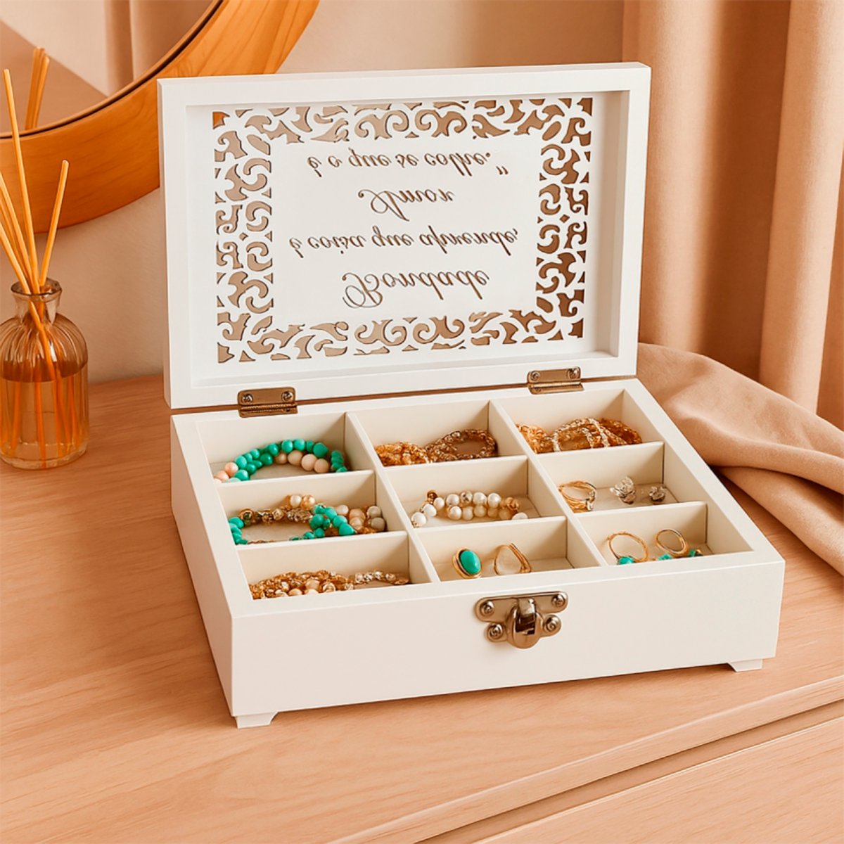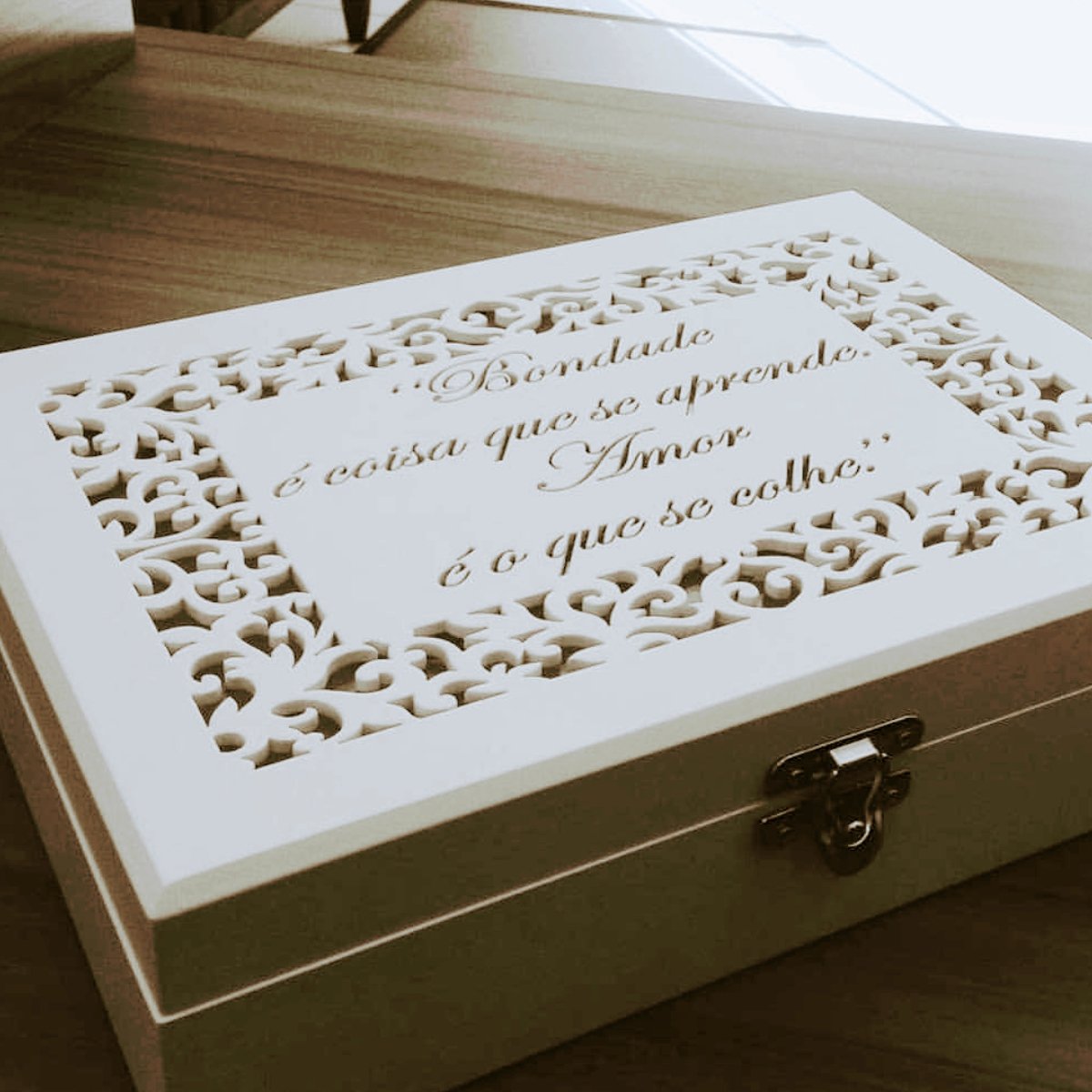 Sua tampa conta com arabesco vazado sofisticado e frase inspiradora, que pode ser personalizada para deixar sua peça ainda mais exclusiva. Com acabamento impecável e cores elegantes — verano, branco, rose e tiffany — ela é perfeita para decorar penteadeiras, closets, aparadores ou presentear alguém especial.