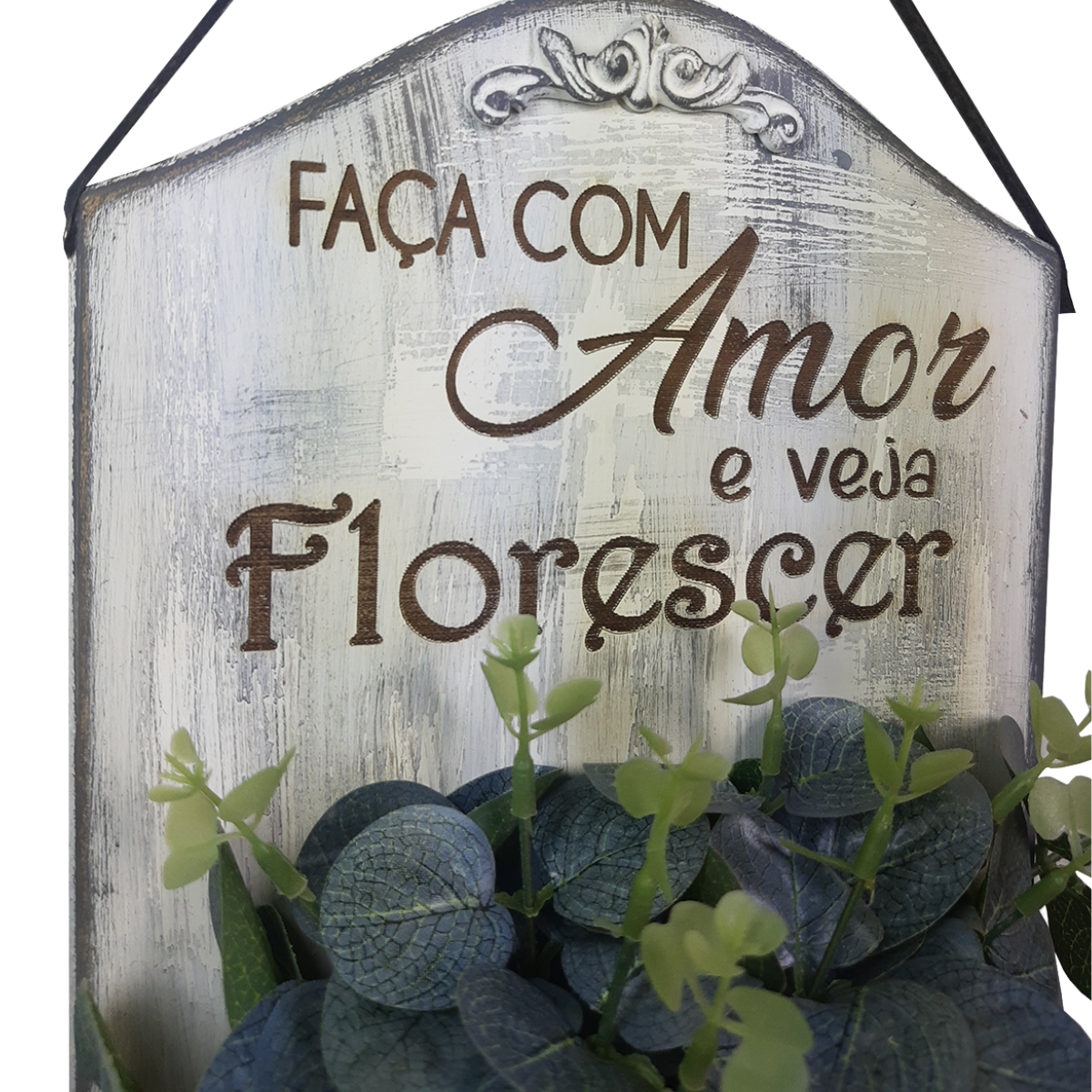 A frase “Faça com amor e veja florescer” é gravada e preenchida diretamente no MDF por corte a laser, garantindo alta durabilidade, excelente definição e acabamento profissional.