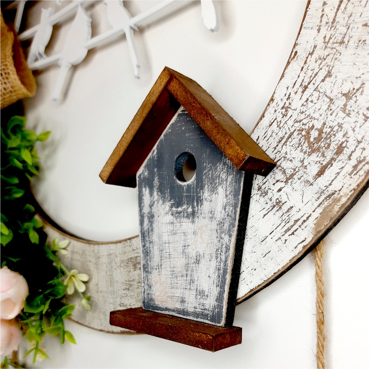 Elementos decorativos: Casinha em MDF, fio com pássaros, laço de juta e arranjo floral