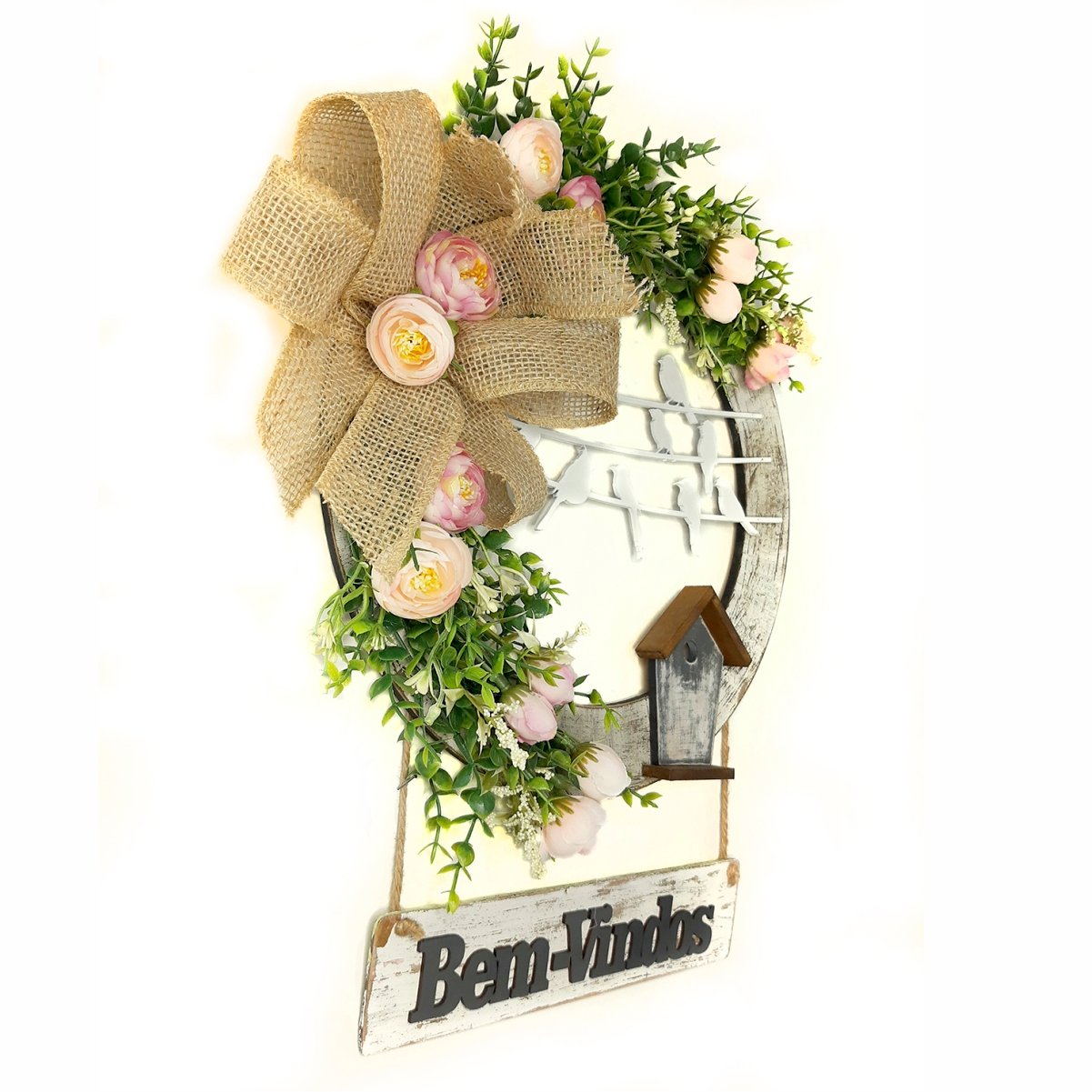 A Guirlanda Pássaros no Fio da Menina Cor é uma peça decorativa que transmite tranquilidade e acolhimento logo na entrada do seu lar. Seu design é composto por um aro rústico em MDF com acabamento desgastado, pássaros pousados em fios metálicos brancos, casinha de passarinho vintage, exuberante laço em juta e flores artificiais em tons delicados de rosa e creme.