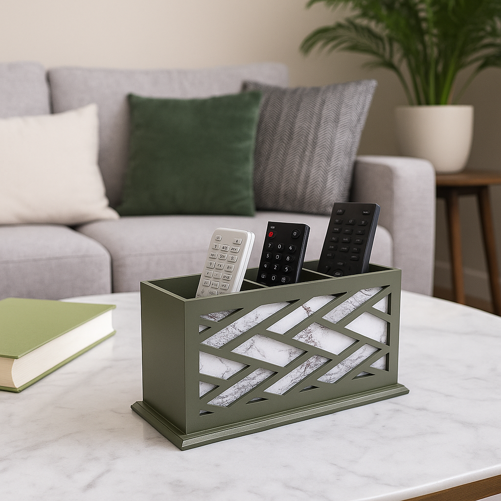 O Porta Controle Carrara para 6 controles foi criado para quem busca organização e elegância na sala. Produzido em MDF com pintura PU de alto padrão, traz design geométrico Carrara e lâmina interna que imita mármore, levando um visual premium ao rack, aparador ou home theater.